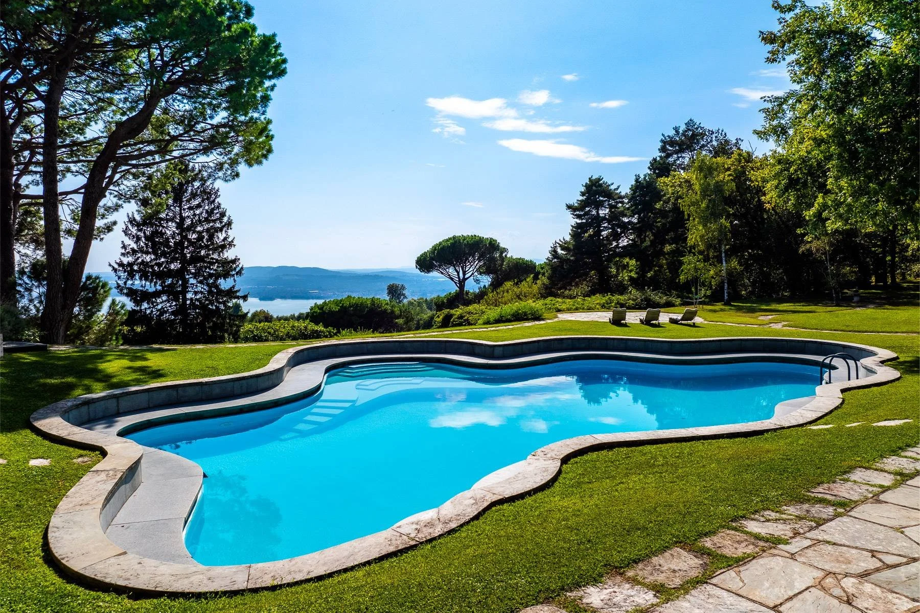 A pergola overlooks a swimming pool said shaped in the outline of Lake Varese.