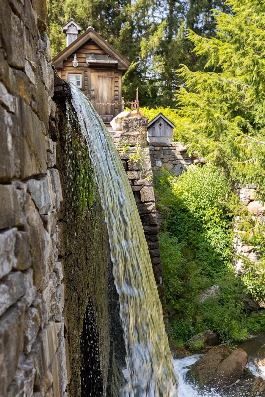 The mill was positioned at a natural drop in Punch Brook Stream, built to harness the falling water that once powered its grinding stones. The water still moves past the stone foundation, visible from inside the house — the same drop that once drove the machinery now reads almost like a private waterfall.