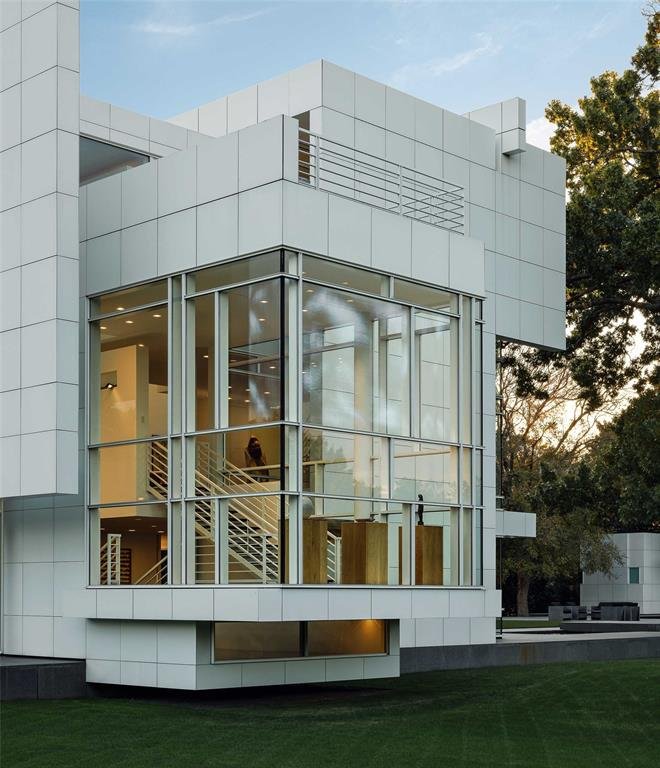 Known as the Rachofsky House, the 9,062 ft² (≈842 m²) residence reflects Richard Meier’s signature modernism—white metal planes, precise geometry, and spaces that open gradually to light and landscape.