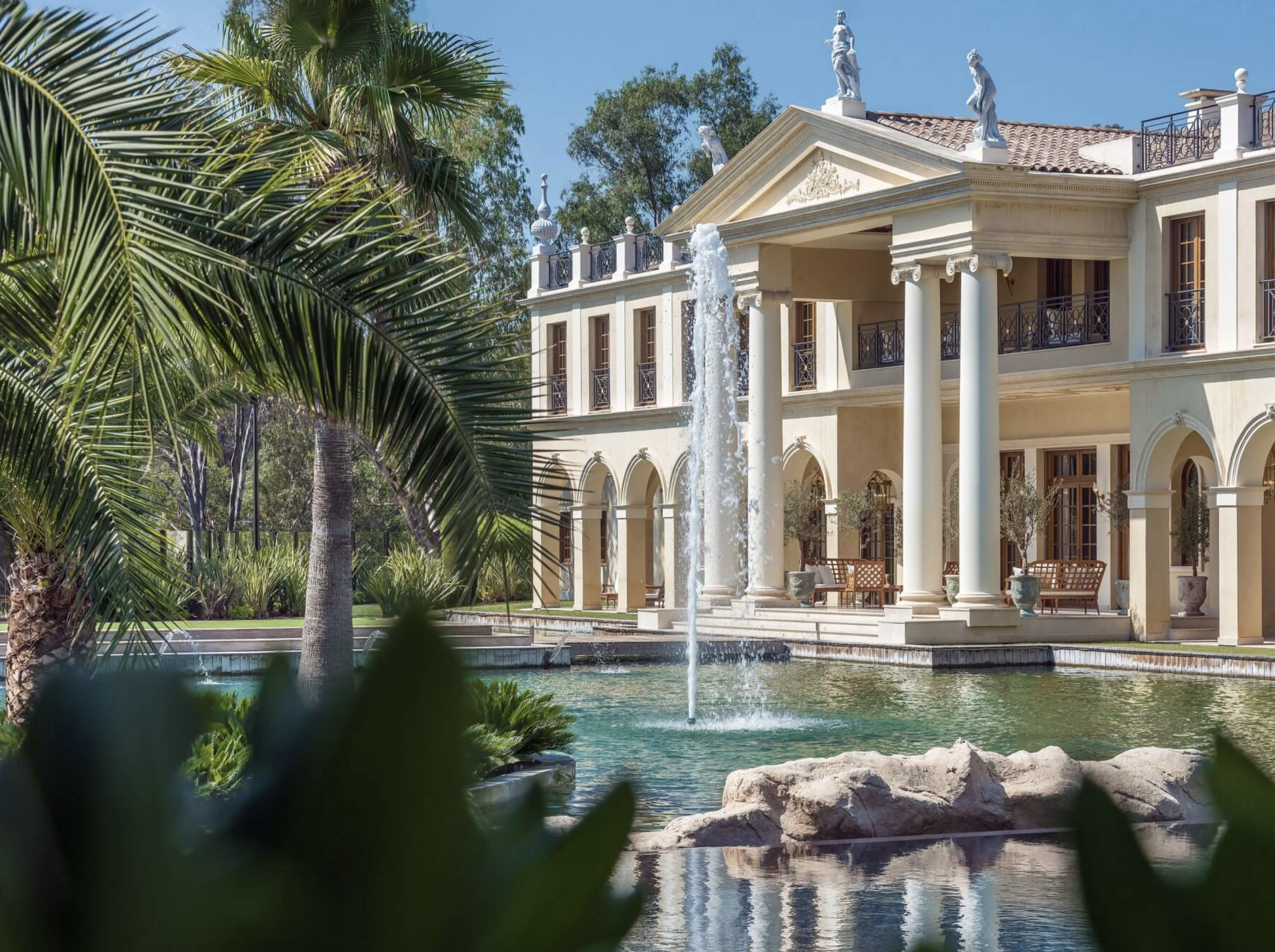 Developed by Cogemad, the property was conceived as a large-scale private residence drawing on Venetian and classical architectural references. Monumental columns, symmetrical façades, and fresco-style interiors define a structure designed around scale and formal composition, positioning the estate closer to a private palace than a conventional Riviera villa.