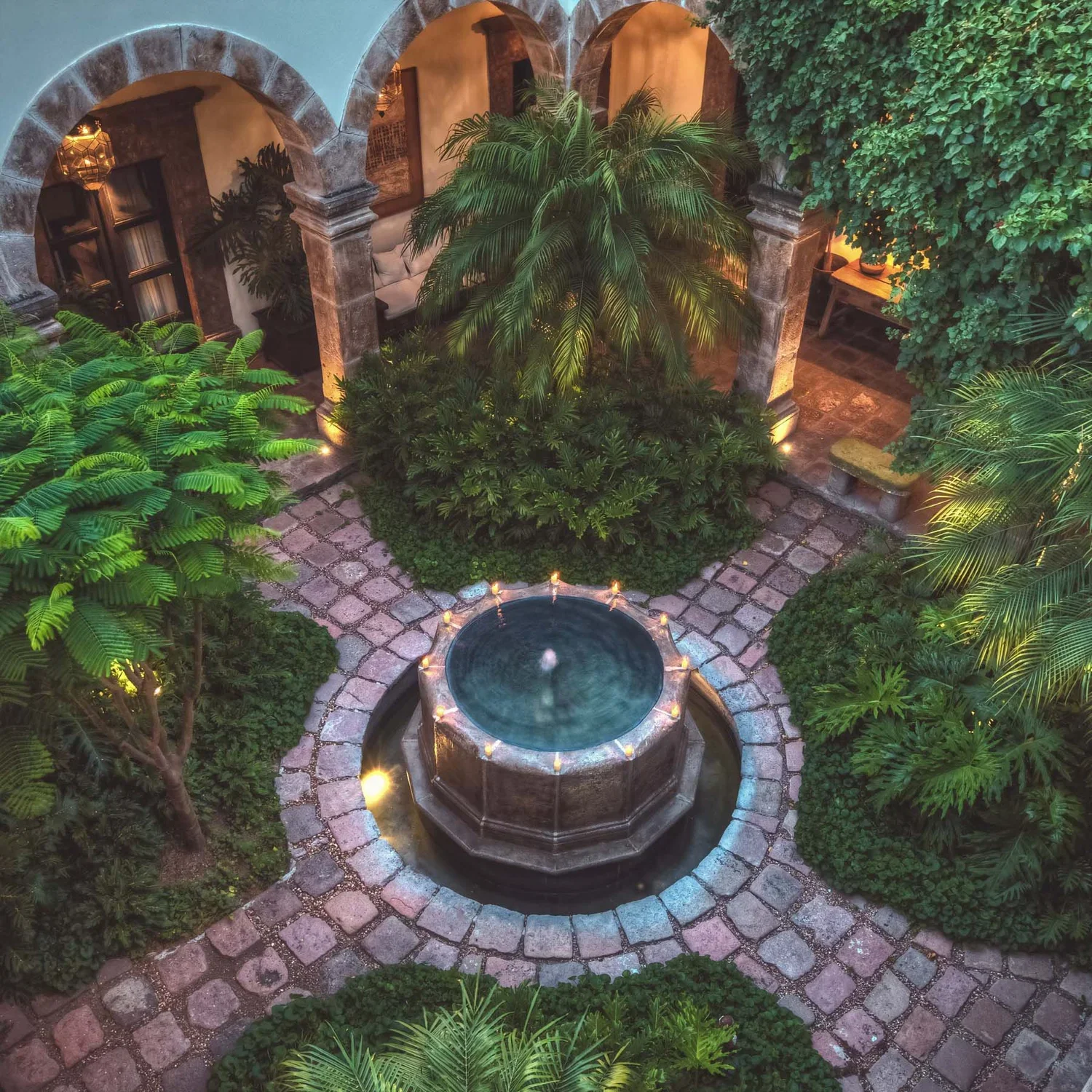 Hidden behind many of San Miguel’s discreet stone façades are grand colonial homes — technically casas señoriales — built in the hacienda style: historic townhouses arranged around an arcaded courtyard with high-beamed ceilings, carved stone details, and lush interior gardens.