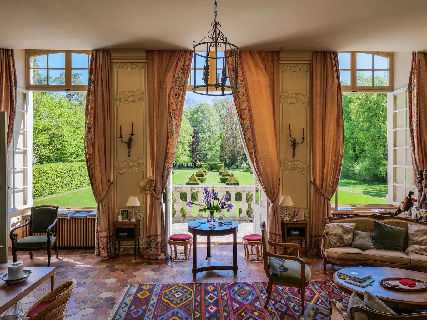 At 600 sqm (6,458 sq ft), the interiors balance authenticity and comfort: cabochon stone floors, oak paneling, marble fireplaces, and a library with Corinthian pilasters. Expansive windows line the main floor, opening to formal parterres, terraced lawns, and mature parkland. Secondary buildings include a restored gîte and a vast attic of 350 sqm (3,767 sq ft) with potential for conversion.