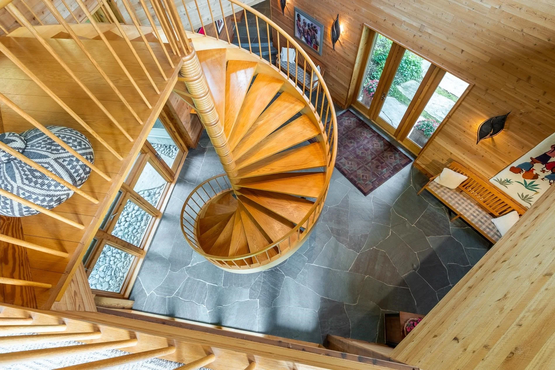 Local artisans were hired for custom features, like the wooden spiral staircase which offers scenic views of the creek beneath the property and a waterfall.